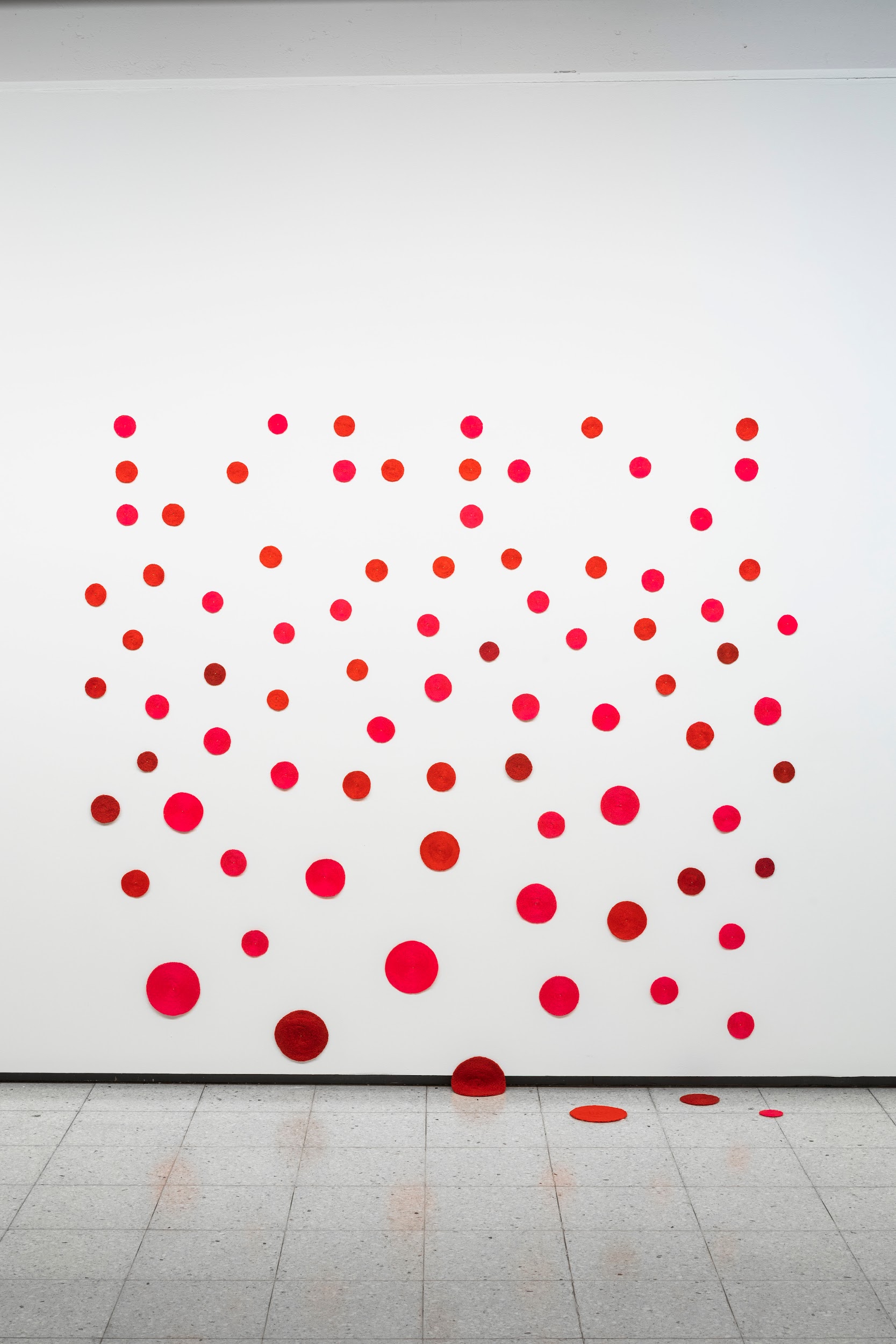 Approximately 60 pieces of red wool thread embroidered circles. The circles form the word Green? in braille.