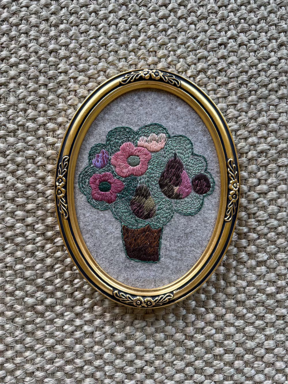 Wood-framed hand embroidery on wool